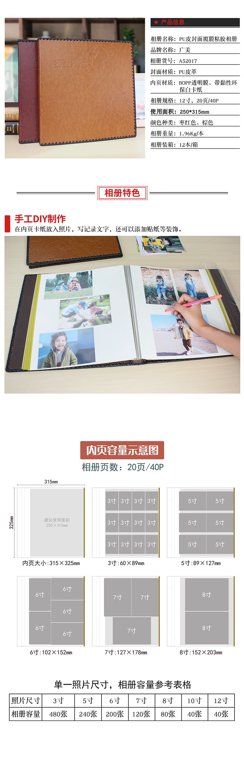 螺丝装PU皮封面12寸覆膜粘胶相册20张(带盒)