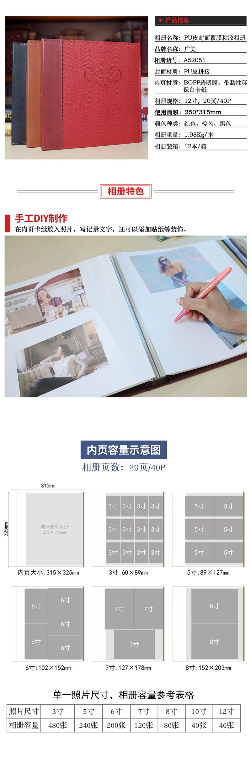 螺丝装PU皮封面12寸覆膜粘胶相册20张(带盒)